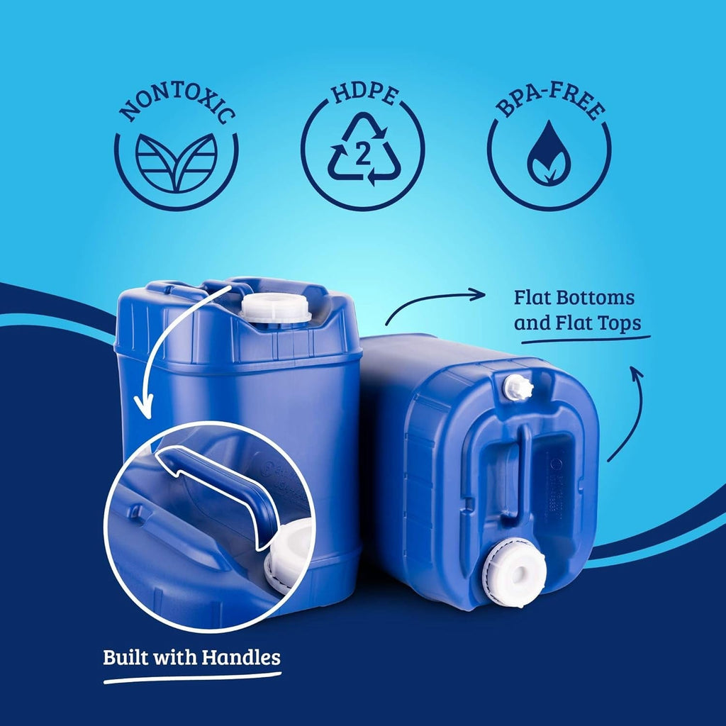 - IDEAL FOR TRAVEL & EMERGENCY STORAGE: If you’re looking for a reliable water container for emergency storage, camping, boating, or beach trips, or even for a watering station for an outdoor event, this kit is exactly what you need. The handle on each 5-gallon container makes it a breeze to transport, and it can easily stack in the back of your car or truck for road-tripping adventures.