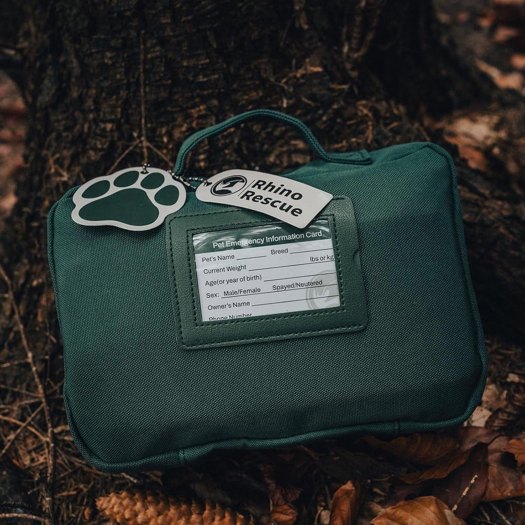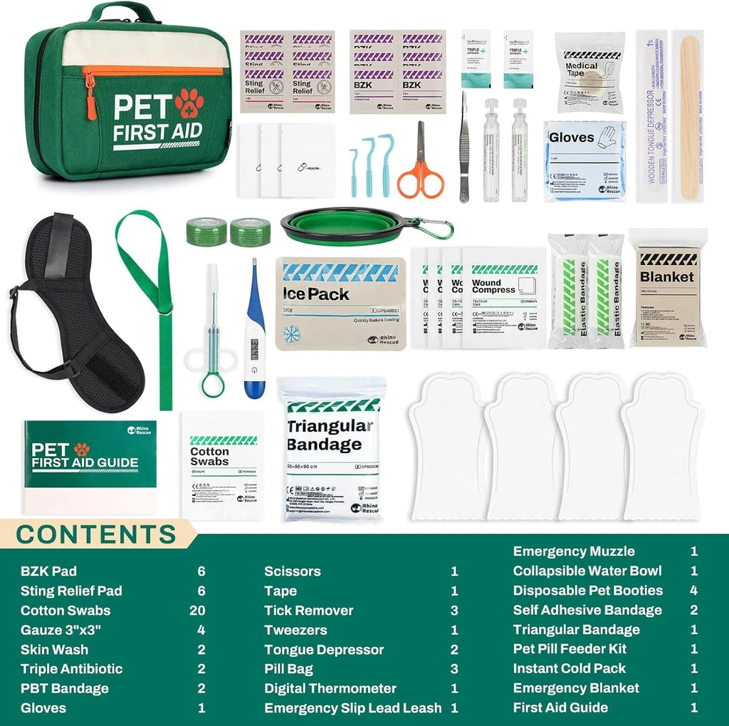 Comprehensive Emergency Protection: RHINO RESCUE pet first aid kit provides comprehensive emergency preparation for your pet, containing gauze, self adhesive bandage, ice pack, emergency blanket and other key first aid supplies to ensure effective initial treatment for your pet in emergency situations. Supports Daily Care Needs: Equipped with a thermometer, feeding kit, muzzle, pill bag, water bowl, and disposable foot booties, this emergency bag can assist with daily pet care and feeding medications, helping you meet your pet's health needs. First Aid Guide: The first aid manual is included to offer guidance for handling common pet emergencies, including heat stroke, trauma and bites. This manual provides helpful tips and steps to support you in staying calm and effectively responding to urgent situations. Durable Materials Kit: The pet medical kit is made of abrasion-resistant fabric and two-way zippers design, which ensures that the gears remain dry and tidy in outdoor conditions. The interior features transparent dividers, making it easy to quickly access items in emergencies. Compact & Portable: The entire pet kit measures 8.5 inches x 6.5 inches x 4.3 inches and weighs only 1.7 pounds. This hiking medical kit is designed to be portable, easy to go out, travel or camp, and convenient to provide your pet with basic first aid support wherever you go