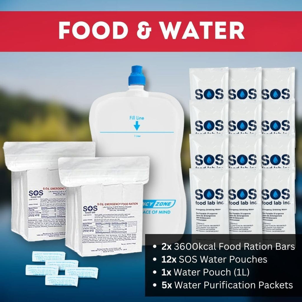- Food & Water- During an emergency, water is vital and access may be limited, skip the trouble of boiling water or wasting any of your precious supply to reconstitute freeze dried meals. The USA MADE SOS BRAND FOOD RATIONS AND WATER included are US Coast Guard approved and have a 5-YEAR SHELF LIFE from manufacture date. The food ration bars are great tasting and calorie dense, require no extra water to rehydrate, no reheating, and were developed to be non-thirst inducing.
